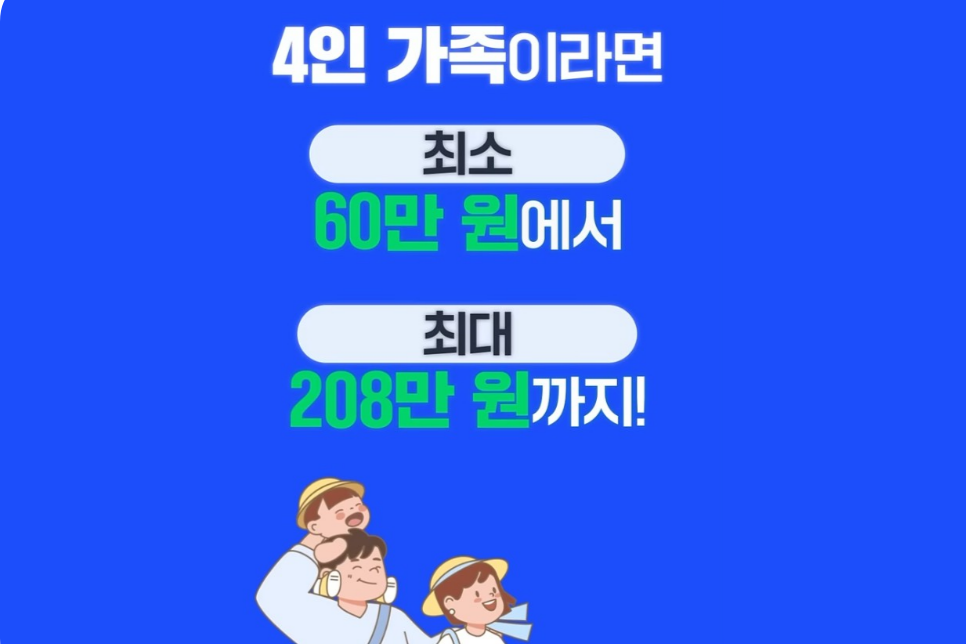 A. 1인당 지급되므로, 4인 가족이면 최소 60만 원부터 최대 208만 원까지 가능하다.