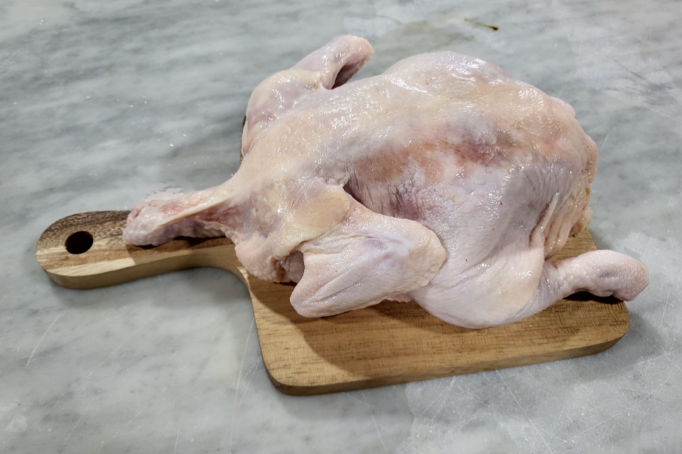 칼과 도마로 생닭을 손질한 후,
