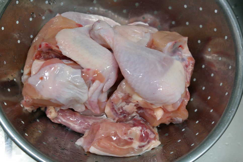 생닭 세척 중,